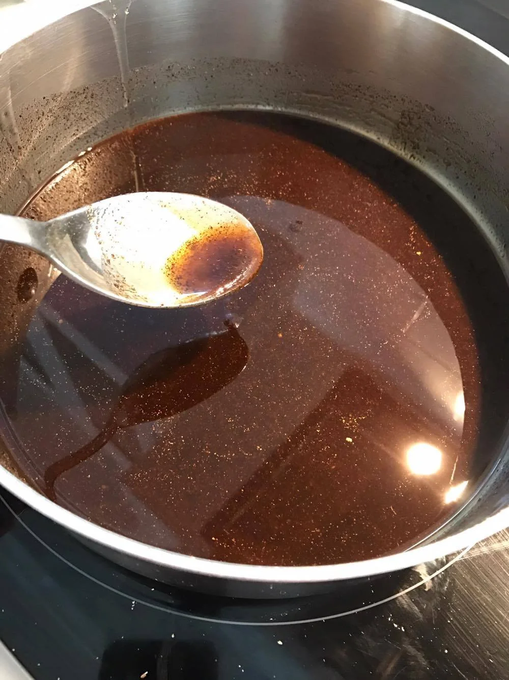 6. On a low heat, stire the Syrup Mix ingredients until they have combined and dissolved, forming a silky, glossy syrup