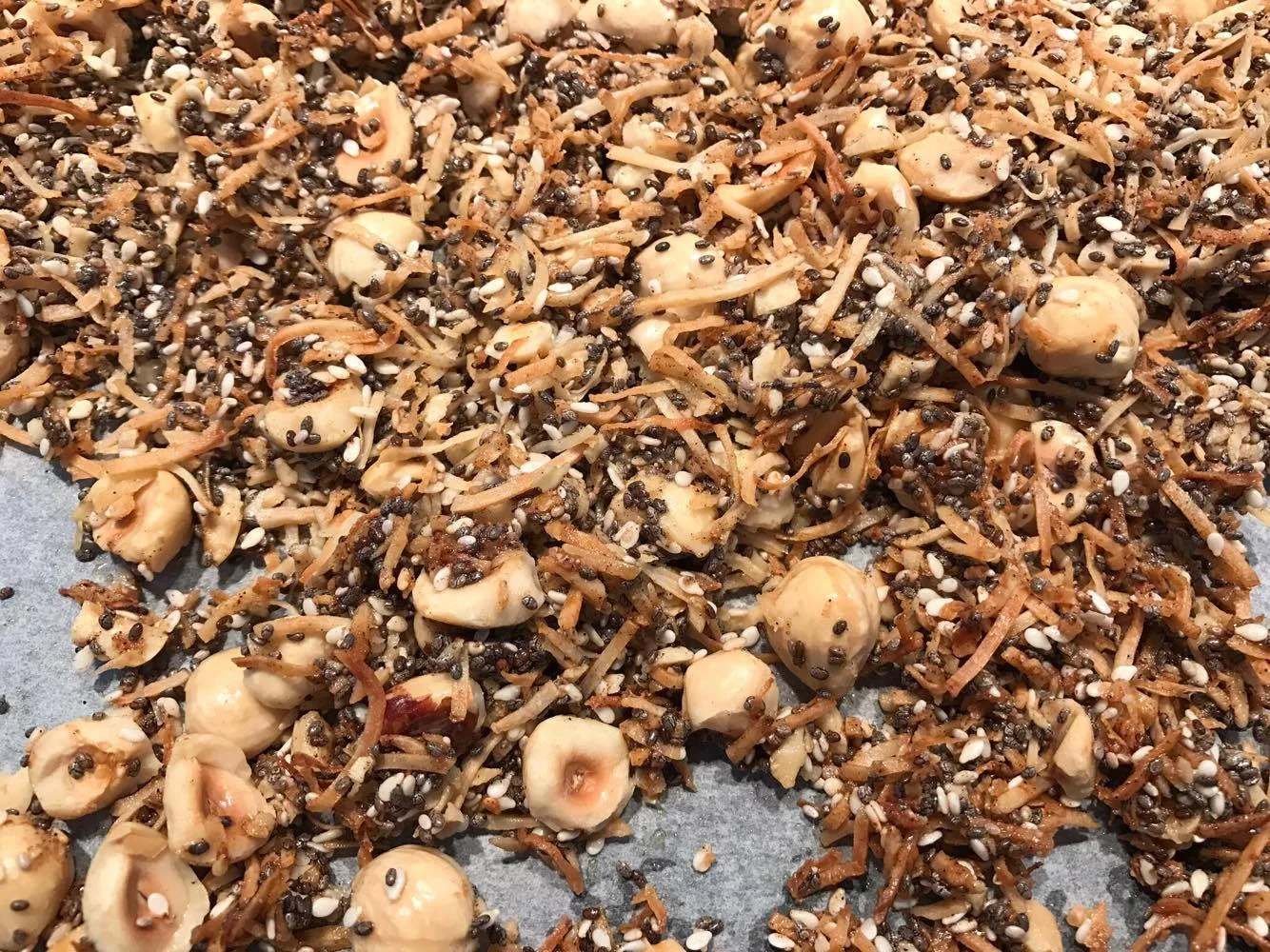11. Do the same with Dry Mix #2, though this will take 15-30 minutes. Rotate and stir every 10 minutes or so, and beware of burning. The coconut will give you the best indication, so turn the oven down and bake for longer if it's browning too quickly. Tip it into the big bowl with the rest of the granola.